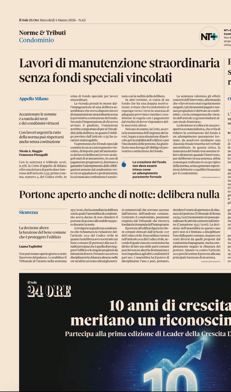 Lavori di manutenzione straordinaria senza fondi speciali vincolati – CLICCA QUI per leggere l’articolo su Il Sole 24 Ore (4 marzo 2026)