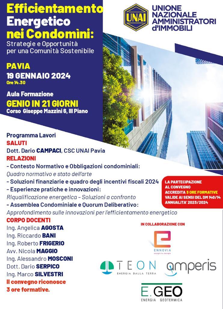 - evento UNAI “Strategia e Opportunità per una comunità sostenibile” – corso di aggiornamento per gli amministratori di condominio DM 140/2017 (19 gennaio 2024)